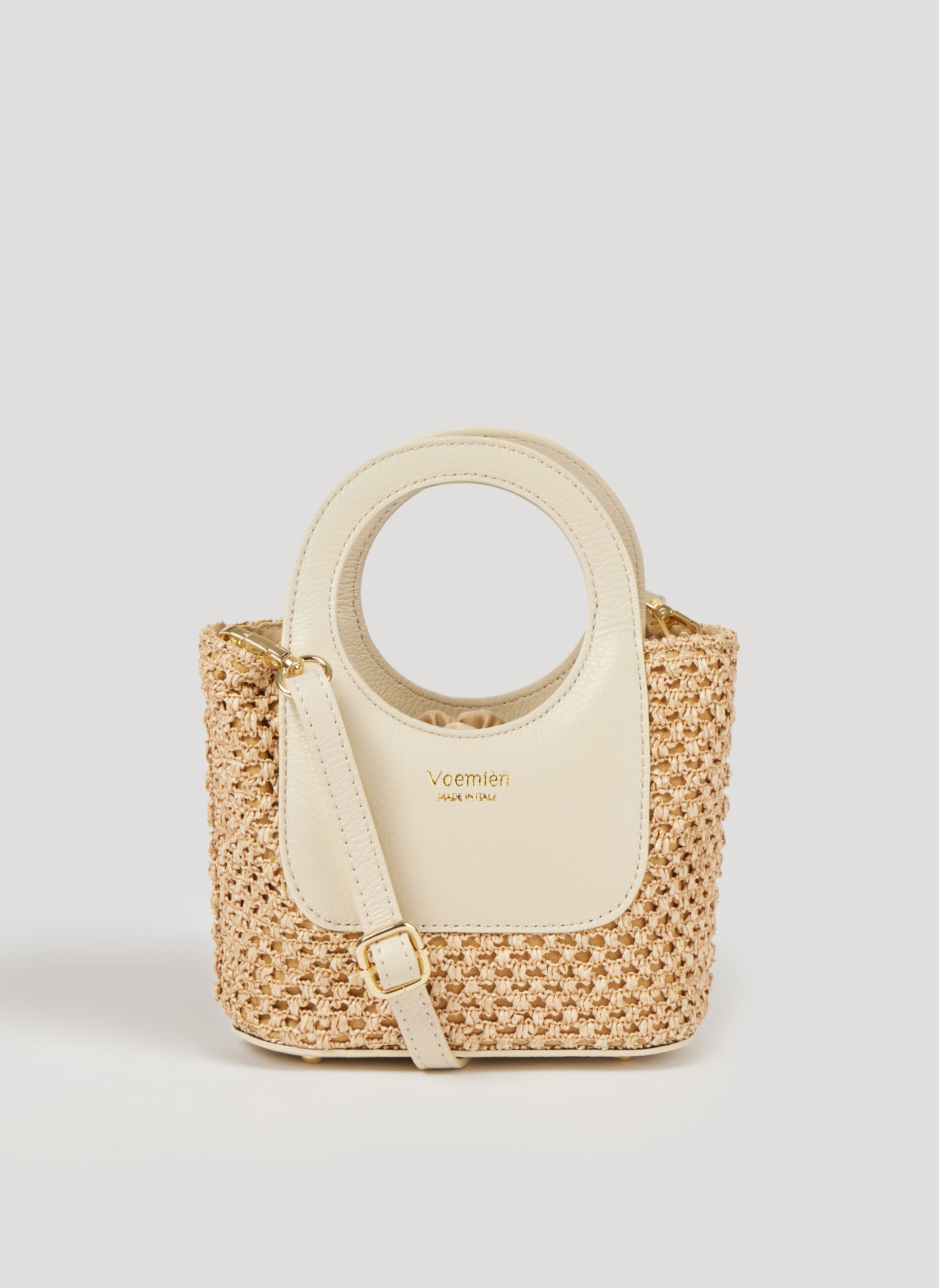 Sac Solène en Raphia Naturelle et Cuir Véritable Made in Italy avec Détails en Or Clair